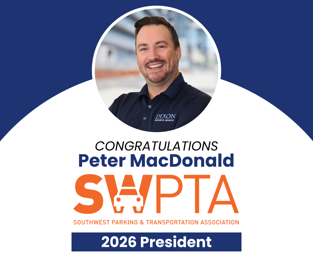 We are proud to announce that DIXON's Peter MacDonald has been elected President of the Southwest Parking and Transportation Association (SWPTA) for 2026. This appointment recognizes Peter's dedication to excellence in parking management as well as his commitment to advancing the industry. Peter brings almost 20 years of experience in parking to this role, along with two previous terms on the SWPTA board. Please join us in congratulating Peter, and we look forward to supporting him as he leads SWPTA through an exciting year ahead!